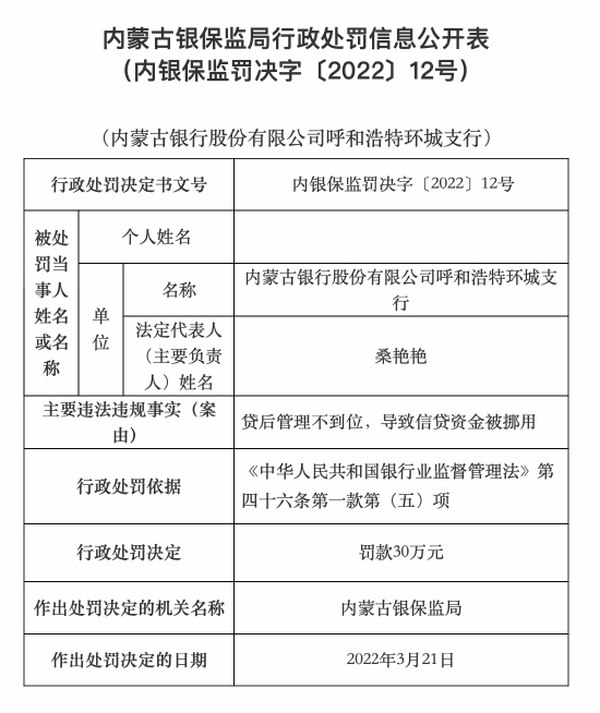4月28日消息,據(jù)內(nèi)蒙古銀保監(jiān)局行政處罰信息公開表顯示,內(nèi)蒙古銀行股份有限公司呼和浩特環(huán)城支行因貸后管理不到位導(dǎo)致信貸資金被挪,被罰款30萬(wàn)元。具體內(nèi)容如下: