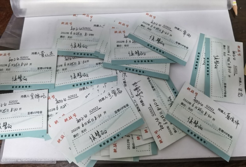 6月20日,呼和浩特市第五中學(xué)初三(4)班班主任侯慧敏老師給班里57名學(xué)生的手寫“告別信”刷屏朋友圈,紙短情長(zhǎng),愛意滿滿。每封信箋做成車票的樣式,正面寫著車次:“挑戰(zhàn)號(hào)”G2022;時(shí)間:2022年6月25日8時(shí)30分;座位:至尊VIP專座;票價(jià):無(wú)價(jià)?!敖K點(diǎn)站”并未填寫。侯慧敏說,那是孩子們的夢(mèng)想,需要靠他們自己來完成。當(dāng)天的畢業(yè)班會(huì)上,當(dāng)每個(gè)學(xué)生打開信箋,滿滿的回憶和濃濃的情誼不禁讓孩子們潸然淚下。