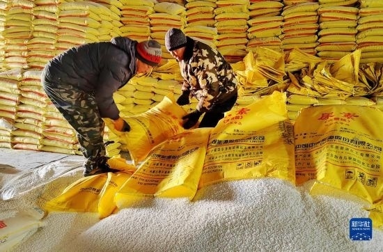 2月16日,北大荒集團(tuán)五大連池農(nóng)場科技服務(wù)中心工人在裝運(yùn)肥料。