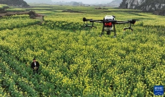 2月17日,在貴州省六盤水市六枝特區(qū)木崗鎮(zhèn)油菜基地,農(nóng)技人員利用植保無人機(jī)進(jìn)行春管。