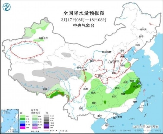 全國降水量預(yù)報圖(3月17日08時-18日08時)