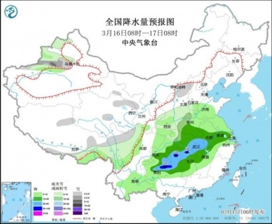 3月16日08時至17日08時,新疆沿天山地區(qū)、西藏東部、山西北部、川西高原北部等地部分地區(qū)有小到中雪。黃淮西部、江淮西部和南部、江漢大部、江南北部和西部、西南地區(qū)東南部等地部分地區(qū)有中到大雨,其中,湖南北部和西部、貴州中東部等地部分地區(qū)有暴雨(50~70毫米),并伴有短時雷暴大風(fēng)、冰雹等強對流天氣。