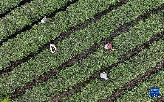3月21日,在湖南省永州市江華瑤族自治縣橋市鄉(xiāng)大魚塘村,茶農(nóng)在茶園采茶(無人機(jī)照片)。