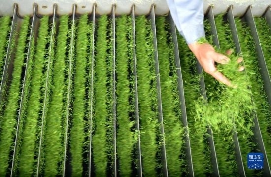 3月22日,在湖北省宣恩縣椒園鎮(zhèn)一茶葉加工廠,工人在檢查傳送帶上的茶葉。