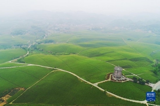 2021年4月12日拍攝的貴州省湄潭縣的“萬畝茶?!憋L光(無人機照片)。