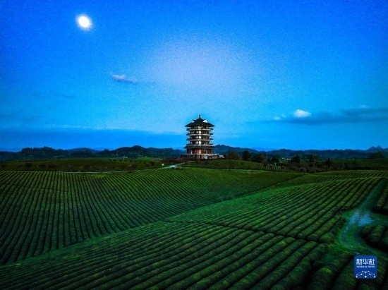 4月4日在遵義市湄潭縣永興鎮(zhèn)拍攝的月光下的“萬畝茶?!保o人機照片)。