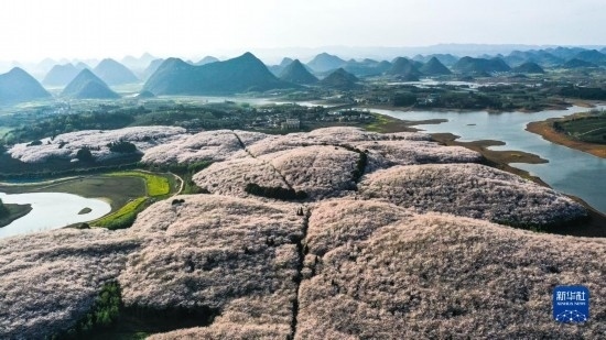 貴州省貴安新區(qū)櫻花園風貌(3月21日攝,無人機照片)。