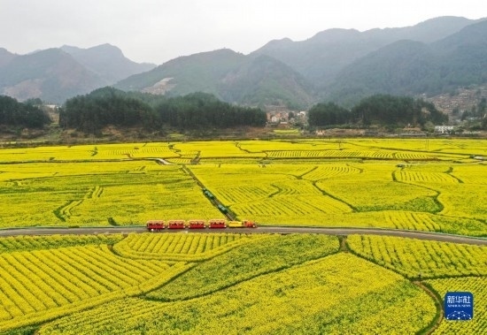 游客乘坐觀光小火車在貴州省貴定縣盤江鎮(zhèn)“金海雪山”景區(qū)觀賞油菜花海(3月12日攝,無人機照片)。