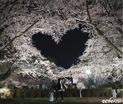 當地時間4月15日,日本青森縣弘前市弘前公園的櫻花進入盛開季。其中,有兩株盛開的櫻花樹枝相互交織,在空中形成了一個愛心形狀,成為熱門觀光景點。