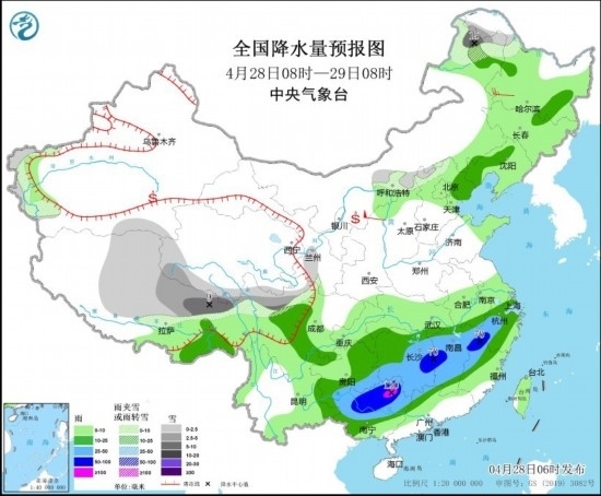 4月28日08時至29日08時,內(nèi)蒙古東北部、黑龍江西北部、新疆南疆盆地西部、西藏北部和東部、青海南部和西部、川西高原北部等地部分地區(qū)有小到中雪或雨夾雪,其中,內(nèi)蒙古東北部、西藏東北部等地部分地區(qū)有大到暴雪(10~15毫米)。遼寧西部、西藏東南部、河北東北部、江南大部、西南地區(qū)東南部、華南北部和西部等地部分地區(qū)有中到大雨,其中,湖南東部、江西中北部、福建西北部、浙江西部、廣西北部等地部分地區(qū)有暴雨或大暴雨(100~120毫米)。內(nèi)蒙古中西部部分地區(qū)有4~6級風(fēng),陜西北部局地有7~8級風(fēng)。