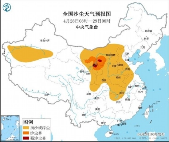受冷空氣大風(fēng)影響,預(yù)計4月28日08時至29日08時,新疆南部、內(nèi)蒙古中西部、甘肅北部和東部、寧夏、陜西、四川盆地北部、山西、河北西部、河南、山東中西部、湖北、湖南北部、安徽北部、江蘇西北部等地的部分地區(qū)有揚沙或浮塵天氣,其中,內(nèi)蒙古西南部、甘肅東北部、寧夏中北部、陜西西北部等地的部分地區(qū)有沙塵暴,局地有強沙塵暴。中央氣象臺4月28日06時發(fā)布沙塵暴藍(lán)色預(yù)警。