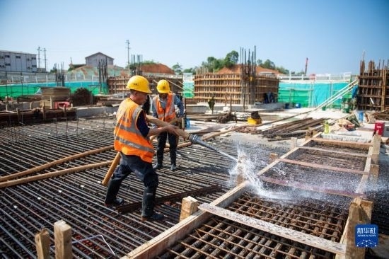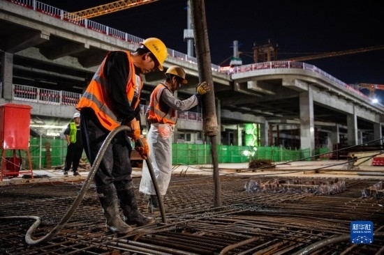 5月3日,在長沙西站建設工地,工人進行混凝土澆筑作業(yè)。