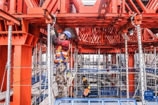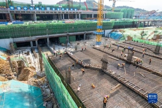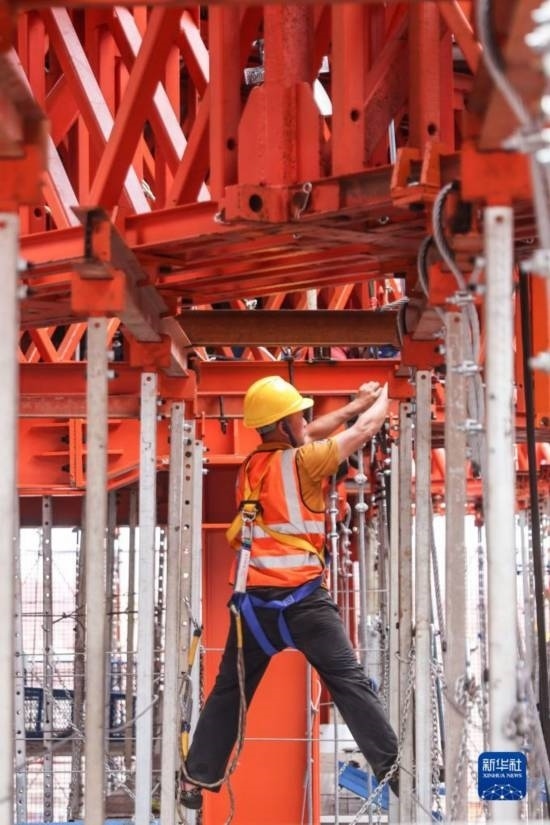 5月3日,中建三局的工人在海南中心項目的“空中造樓機”內施工。