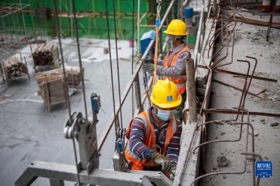 5月3日,工人在湖南長沙智谷項目建設工地為一棟高層建筑安裝幕墻。