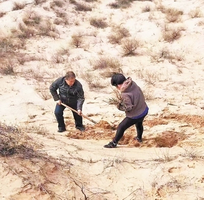 2007年,賈道爾吉和妻子在沙漠里植樹。伊金霍洛旗林草局供圖
