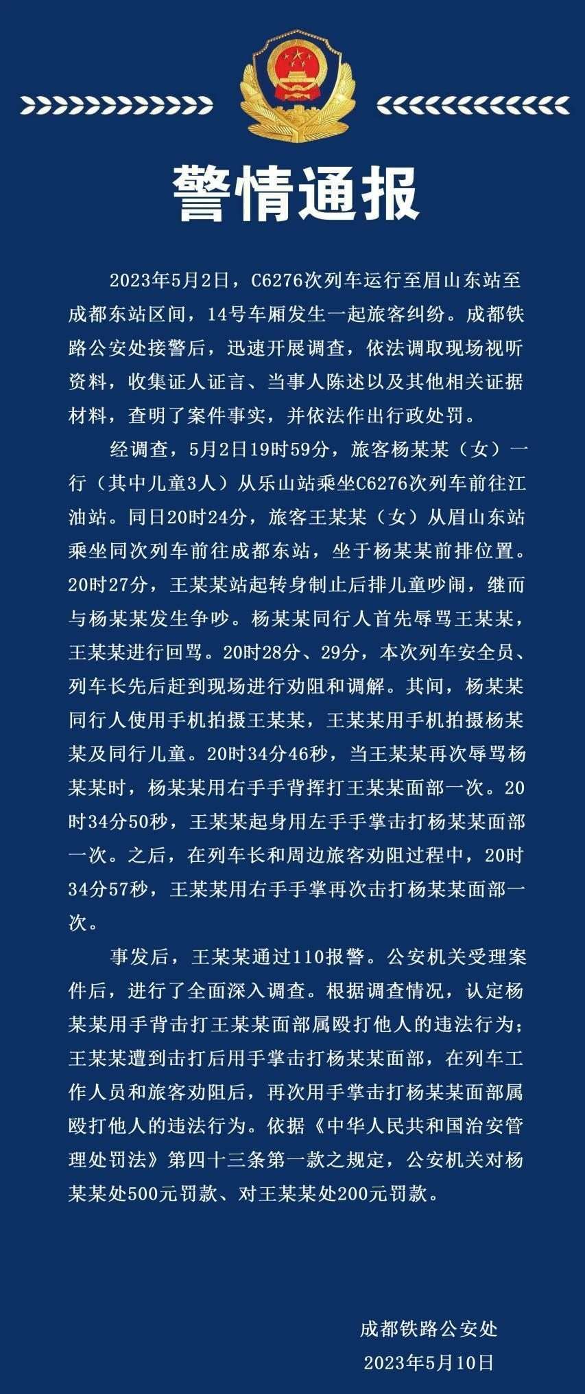 ·成都鐵路公安處通報(bào)高鐵掌摑事件:王某某遭擊打后兩次擊打楊某某面部,雙方均違法。