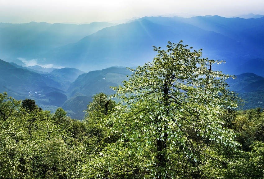 時(shí)下,正是珙桐花開的季節(jié),一朵朵珙桐花如白鴿舒展雙翅,在林中翩翩起舞,為美麗的大風(fēng)頂增添了一絲靈動(dòng)。