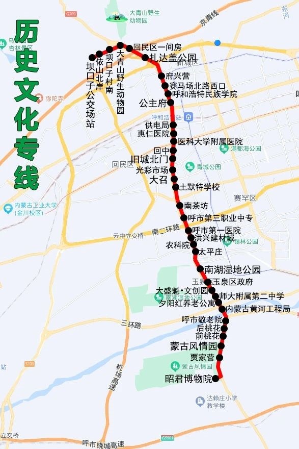 沿途設(shè)站:壩口子公交場站、依山北岸、壩口子村南、大青山野生動(dòng)物園、回民區(qū)一間房、扎達(dá)蓋公園、府興營、賽馬場北路西口、呼和浩特民族學(xué)院、公主府、供電局、匯仁醫(yī)院、醫(yī)科大學(xué)附屬醫(yī)院、回中、舊城北門、光彩市場、大召、土默特學(xué)校、南茶坊、呼市第三職業(yè)中學(xué)、呼市第一醫(yī)院、洪興建材城、農(nóng)科院、太平莊、南湖濕地公園、玉泉區(qū)政府、大盛魁文創(chuàng)園、師大附屬第二中學(xué)、夕陽紅養(yǎng)老公寓、內(nèi)蒙古黃河工程局、呼市敬老院、后桃花、前桃花、蒙古風(fēng)情園、賈家營、昭君博物院。