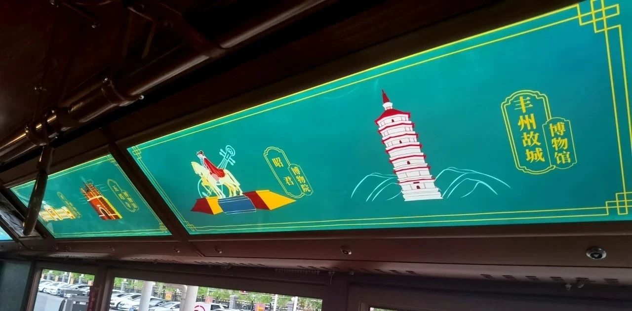 除了復(fù)古風(fēng)的車身外型,主題車廂內(nèi)也充滿了如詩如畫的文旅元素,為乘客們顯示了五塔寺、昭君博物院、豐州故城博物館等本土旅游勝地,乘坐鐺鐺車,乘客在瀏覽美麗街景的同時(shí),也可通過車內(nèi)看板了解到青城的名勝古跡。