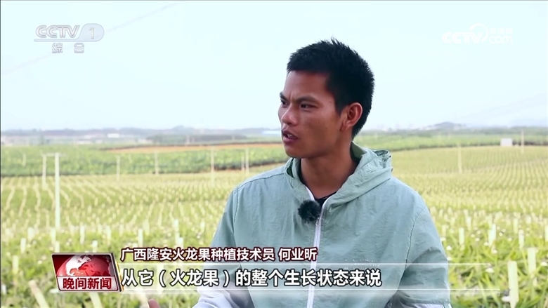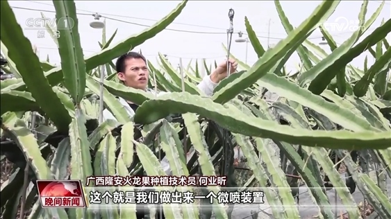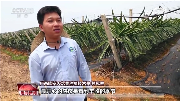 隆安火龍果種植技術(shù)員 林冠熙:不再是以前的那種面朝黃土背朝天的農(nóng)業(yè)模式,有時(shí)我們可能在電腦面前點(diǎn)開(kāi)開(kāi)關(guān),我們就可以給植物灌水灌肥。最開(kāi)心的應(yīng)該是看到豐收的季節(jié),看到滿(mǎn)地滿(mǎn)果通紅的畫(huà)面,就覺(jué)得這是豐收的喜悅。