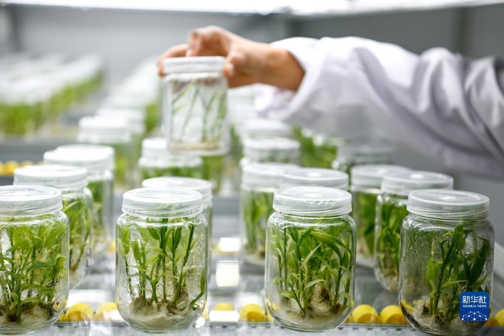 5月23日,工作人員在貴陽市開陽縣南江蔬菜良種繁育中心的組培中心查看小黃姜苗生長情況。