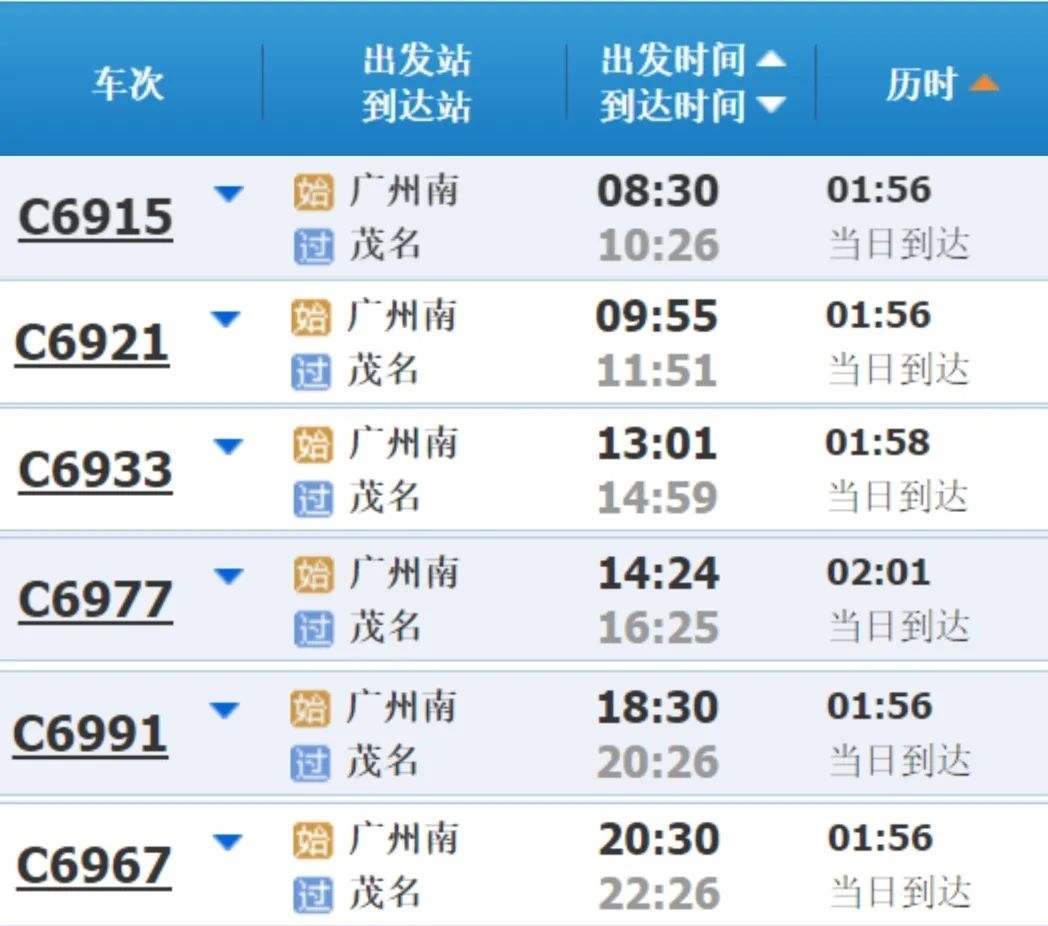 廣州南站至茂名直達(dá)車: