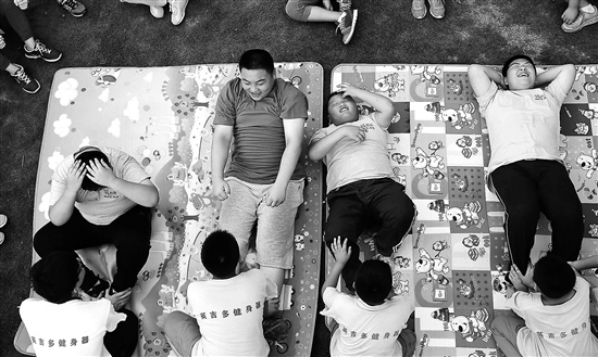 在一個(gè)中小學(xué)超重學(xué)生健康夏令營(yíng)里,孩子們?cè)谧鲅雠P起坐。何海兒 攝/視覺(jué)中國(guó)