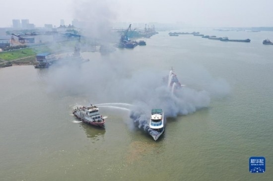 6月2日,在水域救援實戰(zhàn)演習(xí)現(xiàn)場,消防救援人員駕駛消防艇在模擬水上滅火行動(無人機照片)。