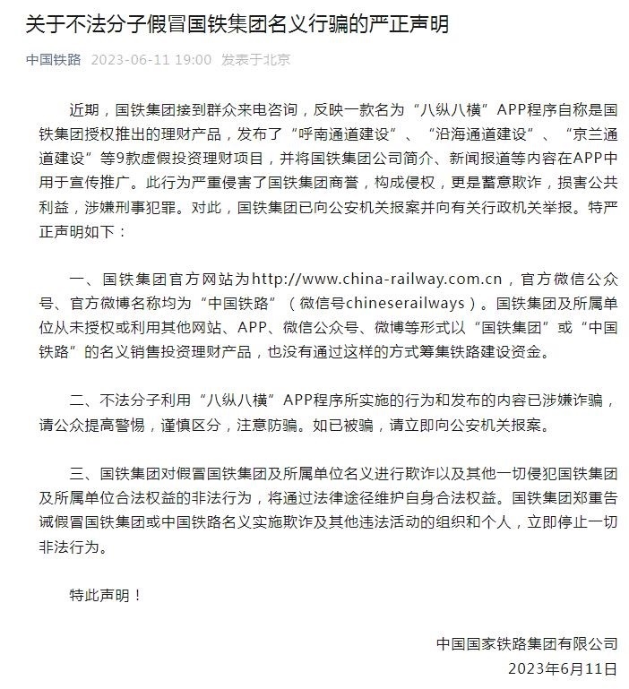 “中國鐵路”微信公眾號6月11日發(fā)布嚴(yán)正聲明稱,近期,國鐵集團(tuán)接到群眾來電咨詢,反映一款名為“八縱八橫”APP程序自稱是國鐵集團(tuán)授權(quán)推出的理財產(chǎn)品,發(fā)布了“呼南通道建設(shè)”、“沿海通道建設(shè)”、“京蘭通道建設(shè)”等9款虛假投資理財項目,并將國鐵集團(tuán)公司簡介、新聞報道等內(nèi)容在APP中用于宣傳推廣。
