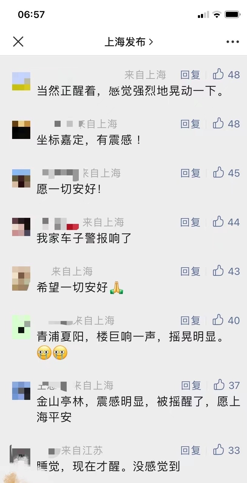 “上海發(fā)布”在微信公眾號留言中回復:市地震局介紹,目前未監(jiān)測到余震,將繼續(xù)做好后續(xù)監(jiān)測工作。