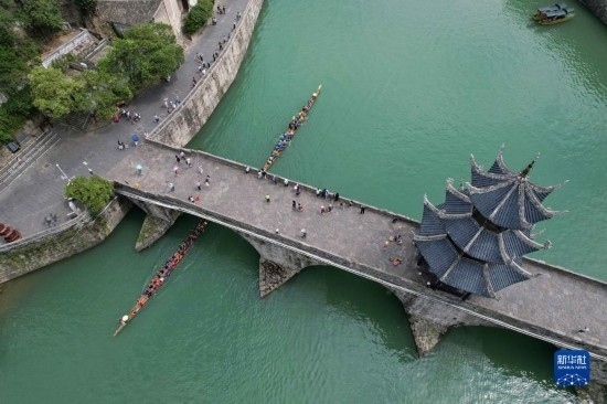 6月17日,游客在鎮(zhèn)遠(yuǎn)古城 陽(yáng)河畔體驗(yàn)劃龍舟(無(wú)人機(jī)照片)。