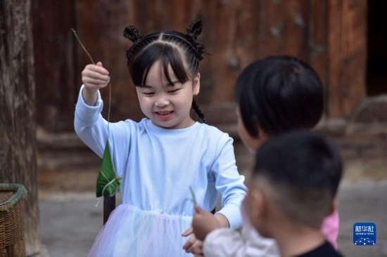6月16日,小朋友在鎮(zhèn)遠(yuǎn)古城 陽(yáng)河畔體驗(yàn)包粽子。