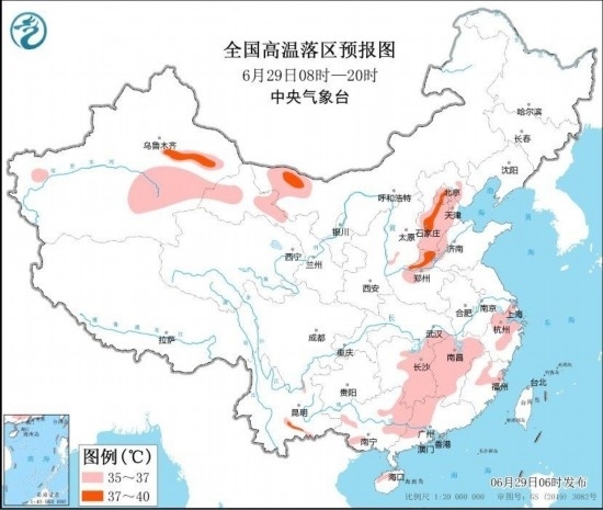 圖3 全國高溫落區(qū)預報圖(6月29日08時-20時) 圖自中央氣象臺網(wǎng)站