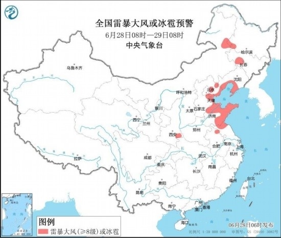 預計,6月28日08時至29日08時,遼東半島、北京東部、天津北部、河北東北部、山東中東部、四川東部、陜西南部、重慶大部、湖北西部等地部分地區(qū)有大到暴雨,其中,重慶北部局地有大暴雨(100~140毫米)。上述部分地區(qū)伴有短時強降水(最大小時降雨量30~50毫米,局地可超過60毫米),內(nèi)蒙古東北部、黑龍江西南部、吉林中西部、遼寧南部、陜西東南部、河北東部、北京東部、天津、山東北部和東部、安徽北部、江蘇北部等地的部分地區(qū)將有8~10級雷暴大風或冰雹天氣,局地風力可達11級(見圖1和圖2)。中央氣象臺6月28日06時繼續(xù)發(fā)布暴雨藍色預警和強對流天氣藍色預警。