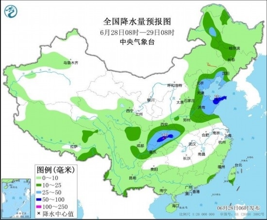圖3 全國降水量預報圖(6月28日08時-29日08時) 圖自中央氣象臺網(wǎng)站