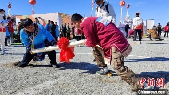 身穿民族特色服飾的赫哲族人在比拼頂杠運(yùn)動(dòng)。中新社記者 姜輝 攝