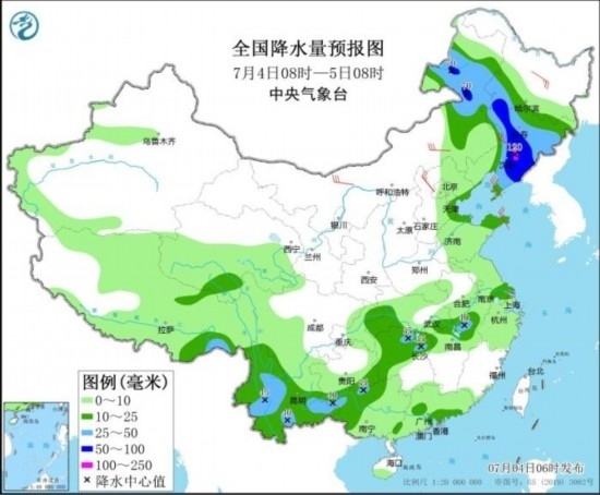 7月4日08時至5日08時,7月4日08時至5日08時,內(nèi)蒙古東北部、黑龍江西南部、吉林、遼寧中東部、云南西部和南部等地部分地區(qū)有大到暴雨,其中,遼寧東北部等地局地有大暴雨(100~120毫米)。內(nèi)蒙古、黑龍江、遼寧、河北北部、山東半島等地部分地區(qū)有4~6級風。