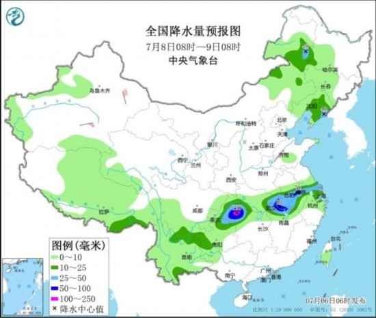 7月8日08時至9日08時,內(nèi)蒙古東北部、黑龍江西南部、遼寧中東部、蘇皖南部、上海、湖北東部和西南部、江西北部、湖南西北部、重慶東南部、貴州北部等地部分地區(qū)有中到大雨,局地有暴雨或大暴雨(100~120毫米)。新疆南疆盆地等地的部分地區(qū)有4~6級風(fēng)。