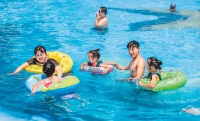 7月1日,游客在河北省遵化市娘娘莊鎮(zhèn)水上樂園戲水避暑。劉滿倉攝(人民圖片)