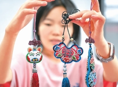 多彩貴州文化產(chǎn)業(yè)投資集團的工作人員在展示苗繡文創(chuàng)產(chǎn)品。