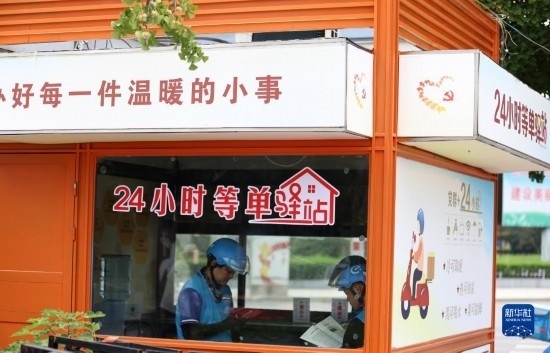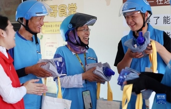 7月7日,在山東省臨沂市郯城縣郯城街道一處24小時(shí)“等單驛站”,郯城街道社區(qū)工作者為等單的外賣配送員送上毛巾、水杯、防曬袖套等防暑物品。