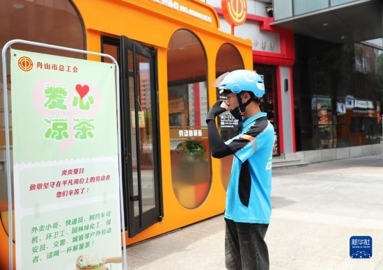 7月7日,外賣配送員在浙江舟山市一處“勞動(dòng)者驛站”飲用“愛心涼茶”。