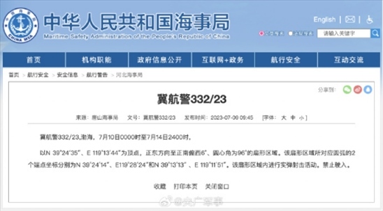 ·航行警告!7月10日0時至7月14日24時,渤海部分海域進行實彈射擊活動,禁止駛入。