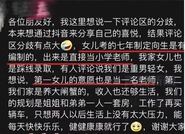 據(jù)女孩媽媽稱,孩子考的“七年貫通培養(yǎng)師范定向生”是有編制的,出來直接當(dāng)小學(xué)老師。家里不缺錢,只希望姐弟倆以后生活輕松快樂。