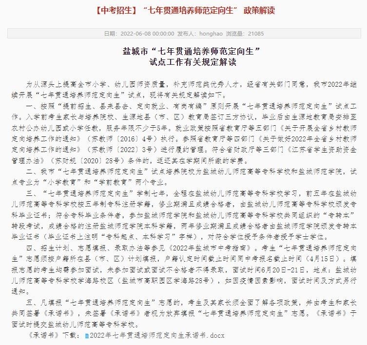 記者從鹽城幼兒師范高等專科學(xué)校官網(wǎng)看到,鹽城市從2021年起開始試點(diǎn)培養(yǎng)“七年貫通師范定向生”,試點(diǎn)培養(yǎng)院校為鹽城幼兒師范高等??茖W(xué)校和鹽城師范學(xué)院,試點(diǎn)專業(yè)為“小學(xué)教育”和“學(xué)前教育”兩個(gè)專業(yè)。