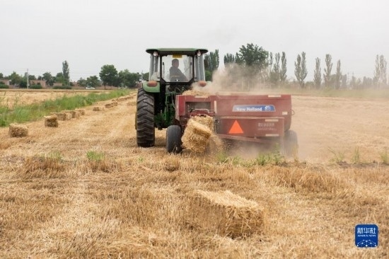 7月10日,在石嘴山市平羅縣姚伏鎮(zhèn),農(nóng)民駕駛秸稈打捆機(jī)回收小麥秸稈。