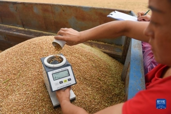 7月10日,在石嘴山市平羅縣姚伏鎮(zhèn),農(nóng)業(yè)工作者對小麥進(jìn)行水分測量。