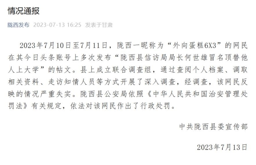 ·信訪局局長被舉報(bào)冒名頂替他人上大學(xué),甘肅隴西縣通報(bào):嚴(yán)重失實(shí)!