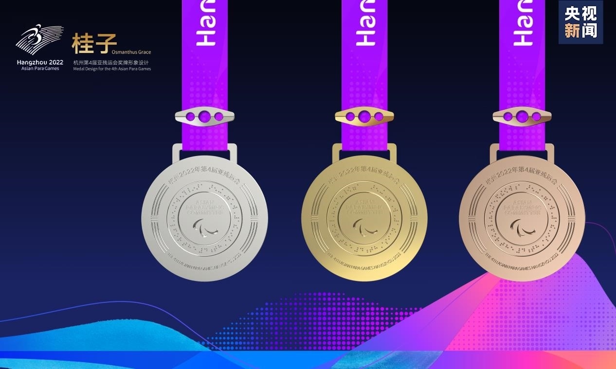 獎(jiǎng)牌正面由桂花與杭州亞殘運(yùn)會(huì)會(huì)徽組合而成;背面則以亞殘奧委會(huì)標(biāo)志為中心環(huán)繞盲文,具有很高的辨識(shí)度,其中盲文的釋義為:杭州第4屆亞殘運(yùn)會(huì)金牌(銀牌、銅牌)。