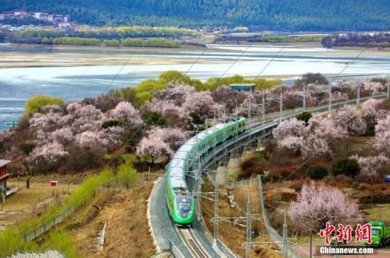 資料圖:桃花、嫩柳與國槐綠涂裝的高原復(fù)興號。 馬生明 攝